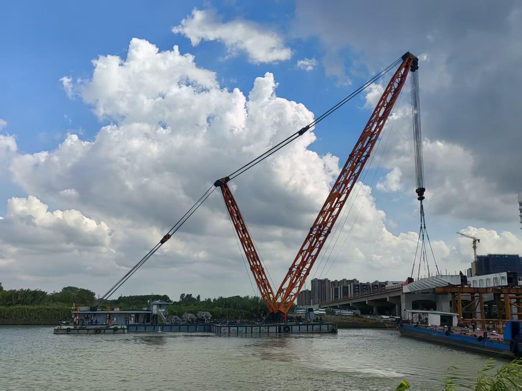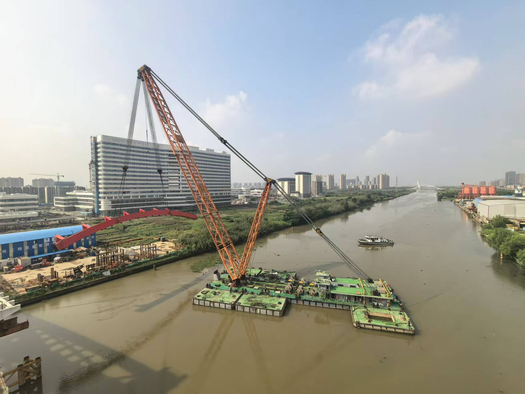 杨子江大桥主桥采用1×122m简支下承式斜靠拱方案,总重4000余吨,由我司“通航007”400吨浮吊船分段吊装。此次吊装实现了毫米级的拼接精度控制,打破传统意义上对于大型起重船“傻大粗”的固化认知,展现了“通航007”船队丰富的施工经验及过硬的技术能力。