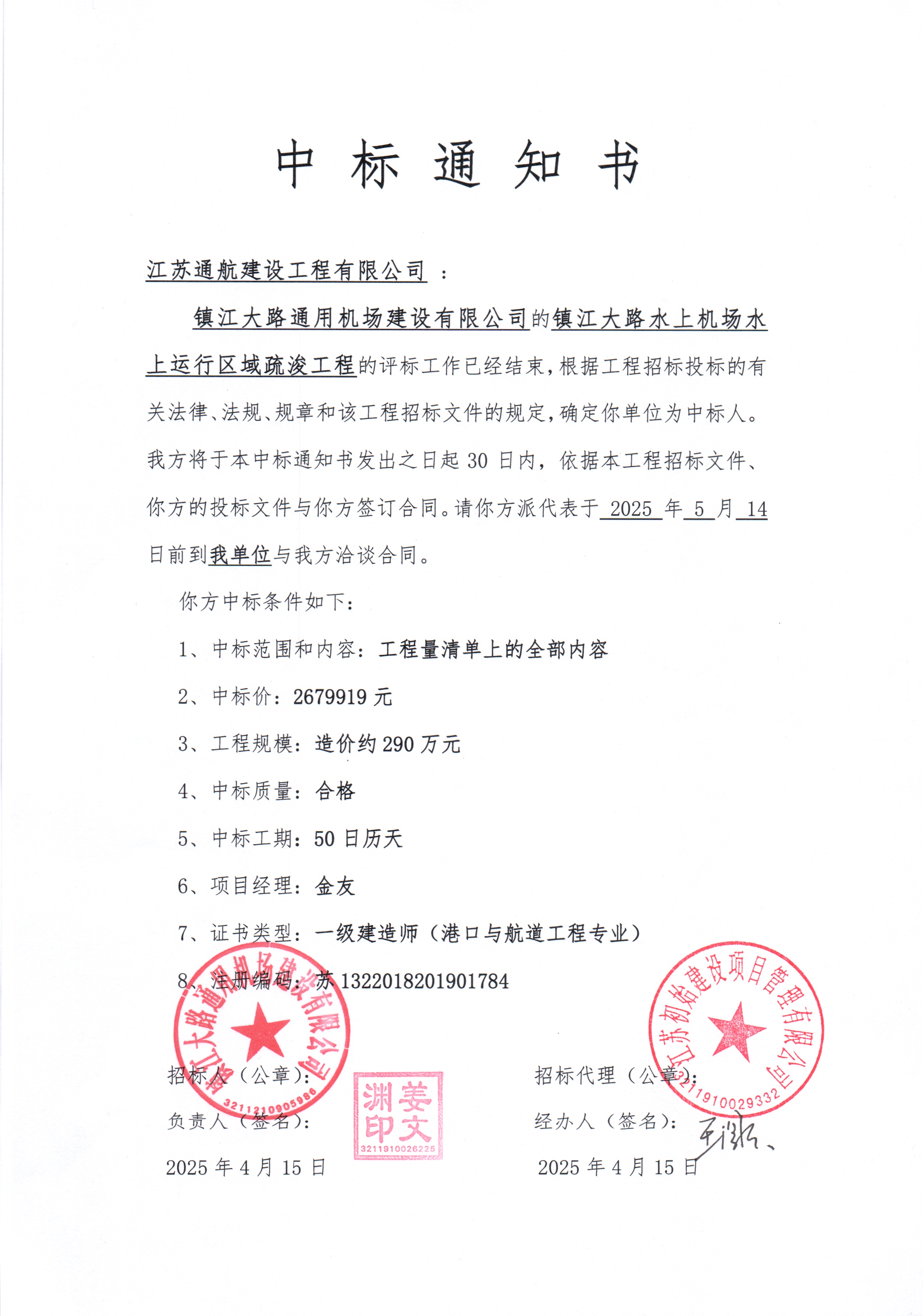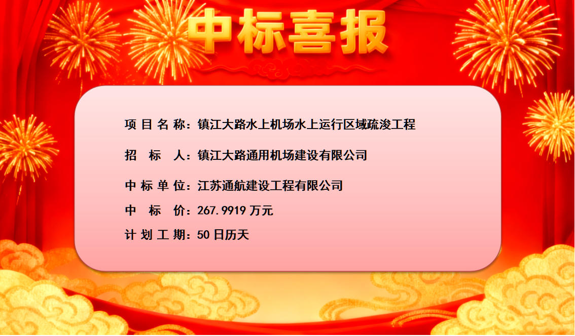 近日,由镇江大路通用机场建设有限公司招标的镇江大路水上机场水上运行区域疏浚工程招标结果揭晓,江苏通航建设工程有限公司成功中标,中标金额为267.9919万元。该项目计划工期50日历天,将以“合格”的工程质量与“安全生产无责任事故”为目标,为镇江大路水上机场的顺利运营奠定坚实基础。