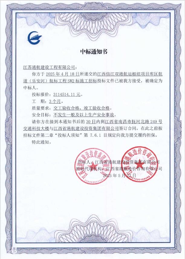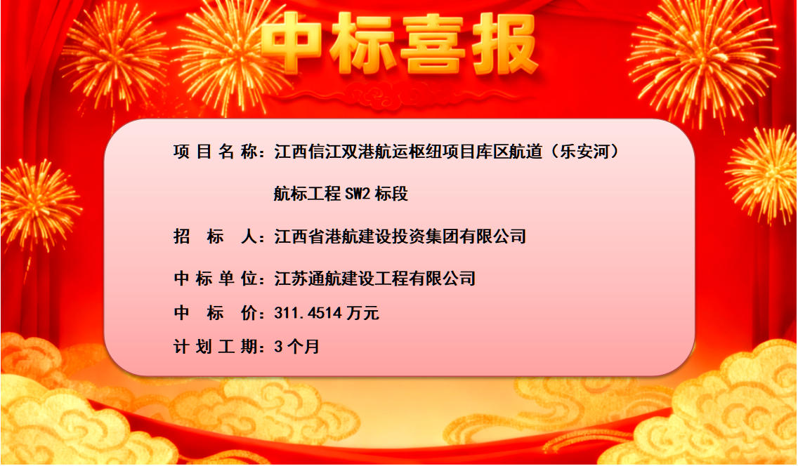 江苏通航建设工程有限公司中标江西信江双港航标工程SW2标段