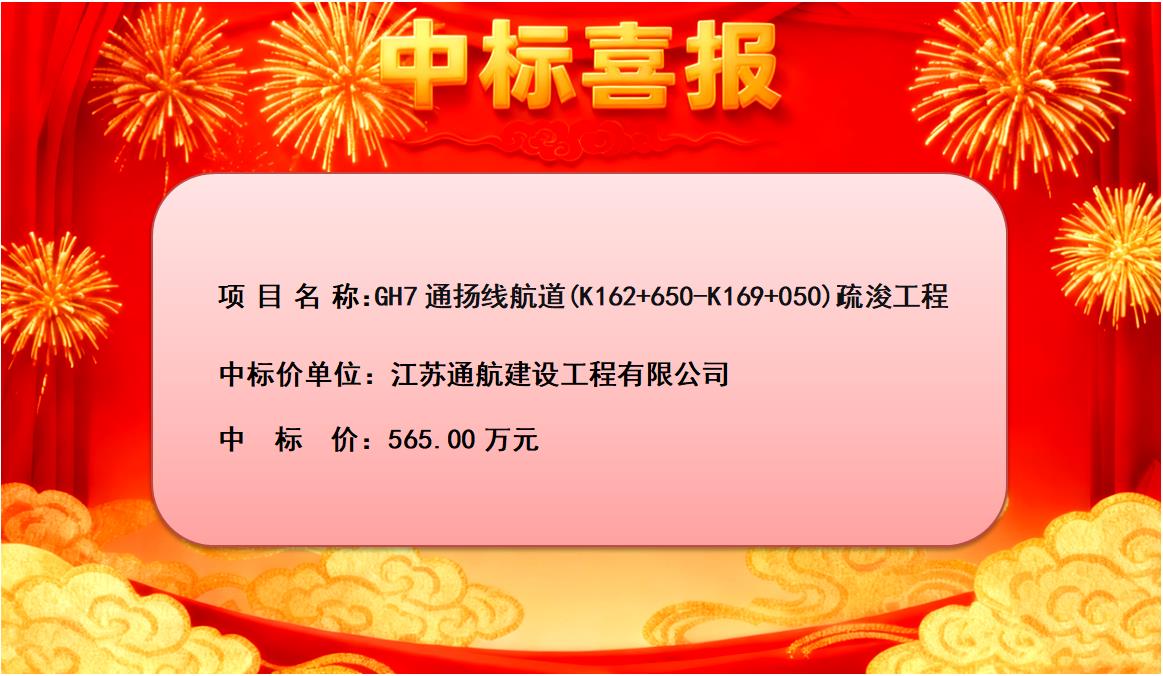 2025年7月22日,江苏通航建设工程有限公司以1208.3570万元中标GH7通扬线航道(K162+650-K169+050)疏浚工程,该项目计划工期6个月。