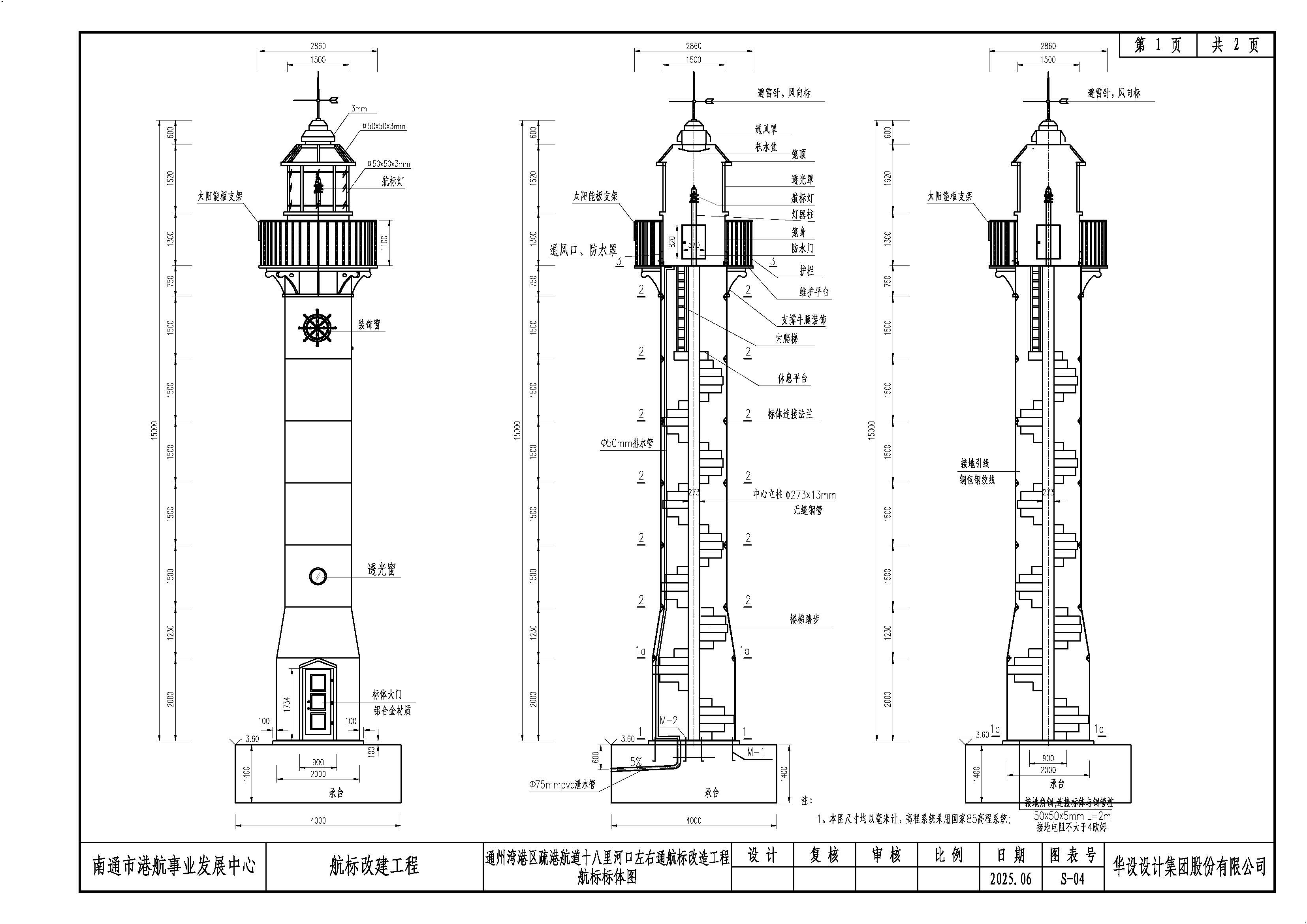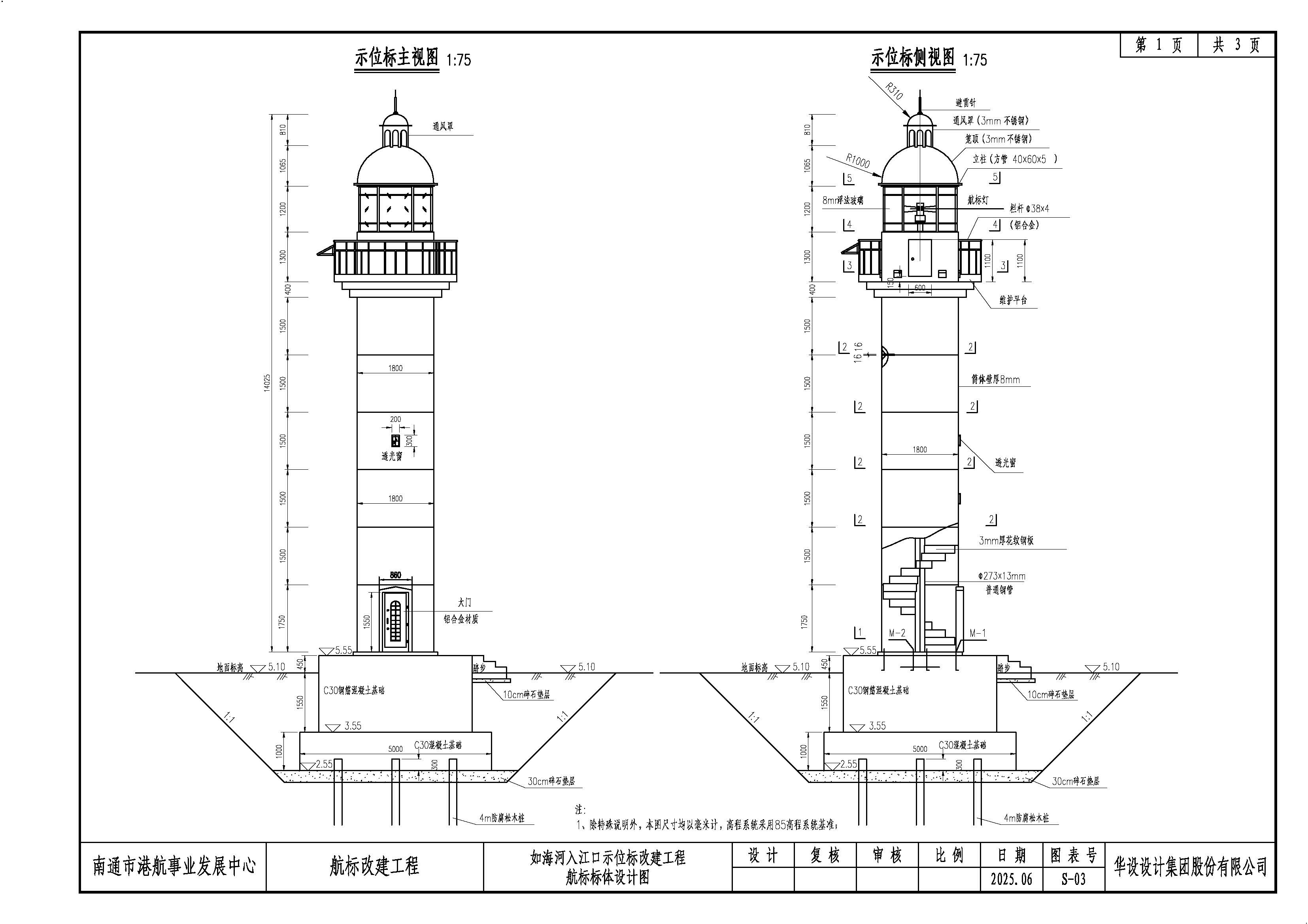 通扬线海安西示位标位于通扬线与连申线交汇西北角,为左右通航标,为提升水运服务、保障通航安全,需改建左右通航标,现调整航标位置至通扬线右岸,设为景观示位标,将原有航标进行拆除作业,同时保留其基础结构,并将原航标灯迁移到新航标上继续使用,改造后航标高13.5m。现状航道等级为三级。如海河入江口示位标位于如海河入江口右岸,为改善原有航标的通视条件不佳的问题,拆除现状高度8m标体,向靠河侧(长江方向)前移9m,遥测号码不变、遥控遥测装置不变,改造后航标高14m。现状航道等级为六级。