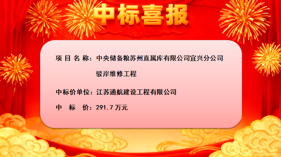 2025年7月2日,我公司参与投标中央储备粮苏州直属库有限公司宜兴分公司驳岸维修工程,项目业主为中央储备粮苏州直属库有限公司。2025年7月8日,中标公告公示我公司中标,中标价格291.7万元。