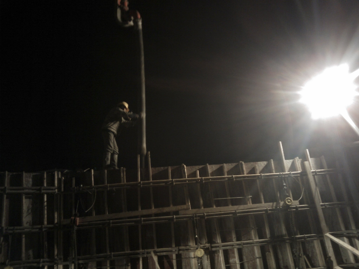 面对新挑战的同时,项目部面临的也是一个新的机遇。为确保按期完工,项目部重新整理思路,调整关键线路和人员,增加设备,错开作业时间,力保在12月28日完成主体工程。(图为夜间浇筑E型墙)