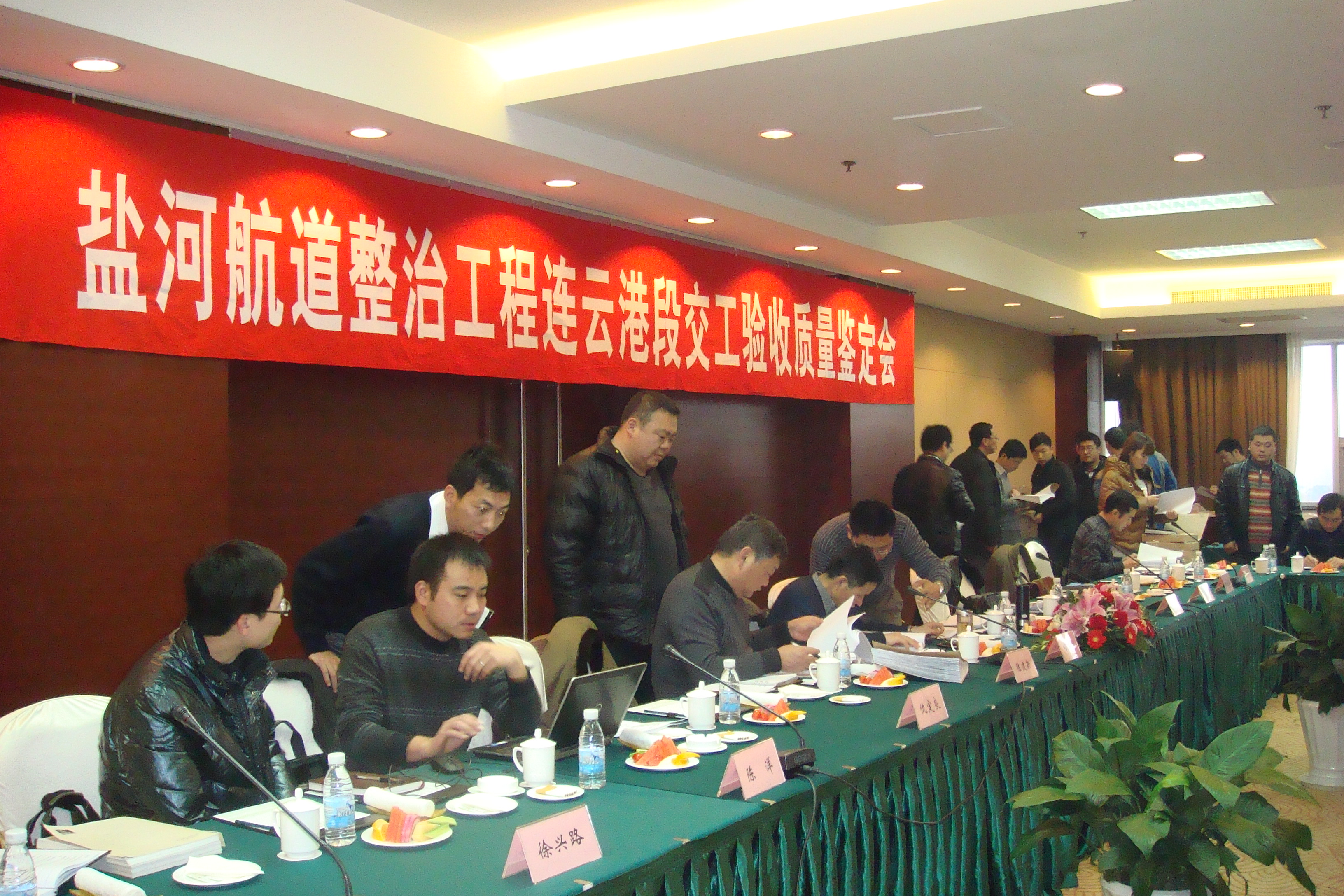 2012年12月20日-21日,省厅、质监局、检测中心、业主、设计代表、监理以及施工单位组织在对施工现场全面检查后,在连云港市云台宾馆召开了盐河航道整治工程连云港段交工验收质量鉴定会,各位专家在听取各方汇报后,集中检查了施工单位档案资料,对我标段的现场及资料标识满意,最终质量鉴定情况为线形顺直,尺寸满足要求,观感质量优良,护岸单位工程、4个分部工程均合格,疏浚单位工程待定,整体暂定合格。