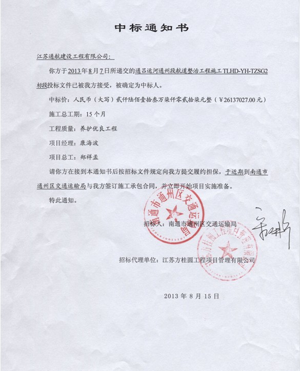 2013年8月7日,通吕运河通州段航道整治工程施工TLHD-YH-TZSG2标段在南通市政务中心公开开标,我公司被推荐为第一中标候选人,中标金额26137027元,项目经理:康海波。