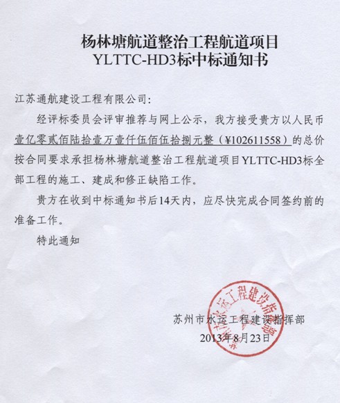 金秋伊始,喜报连连。继通吕运河航道整治工程通州段2标中标后,2013年8月23日我公司在杨林塘航道整治工程航道项目太仓段YLTTC-HD3标段招标项目的竞标中,凭借合理的投标报价和良好的企业信誉,再次顺利中标,中标价102611558元。在此特向公司各位同仁通报喜讯。