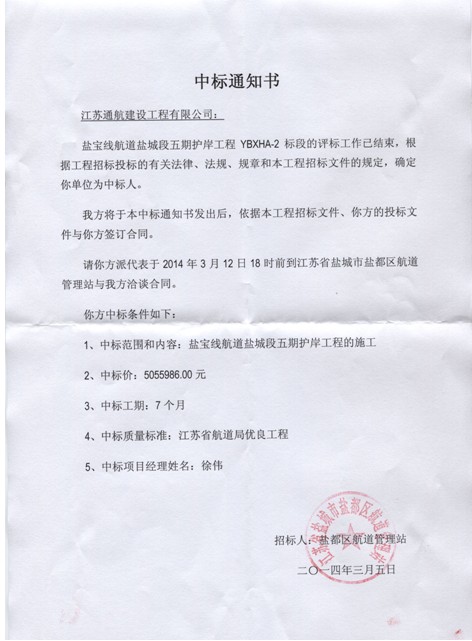 奋力拼搏创佳绩,新春伊始开门红。在公司领导的大力支持下,通过精心组织安排,各部门同事积极协助,我公司在盐宝线航道盐城段五期护岸工程项目激烈的投标竞争中脱颖而出,成功中标本工程YBXHA-2标段,中标价5055986元。