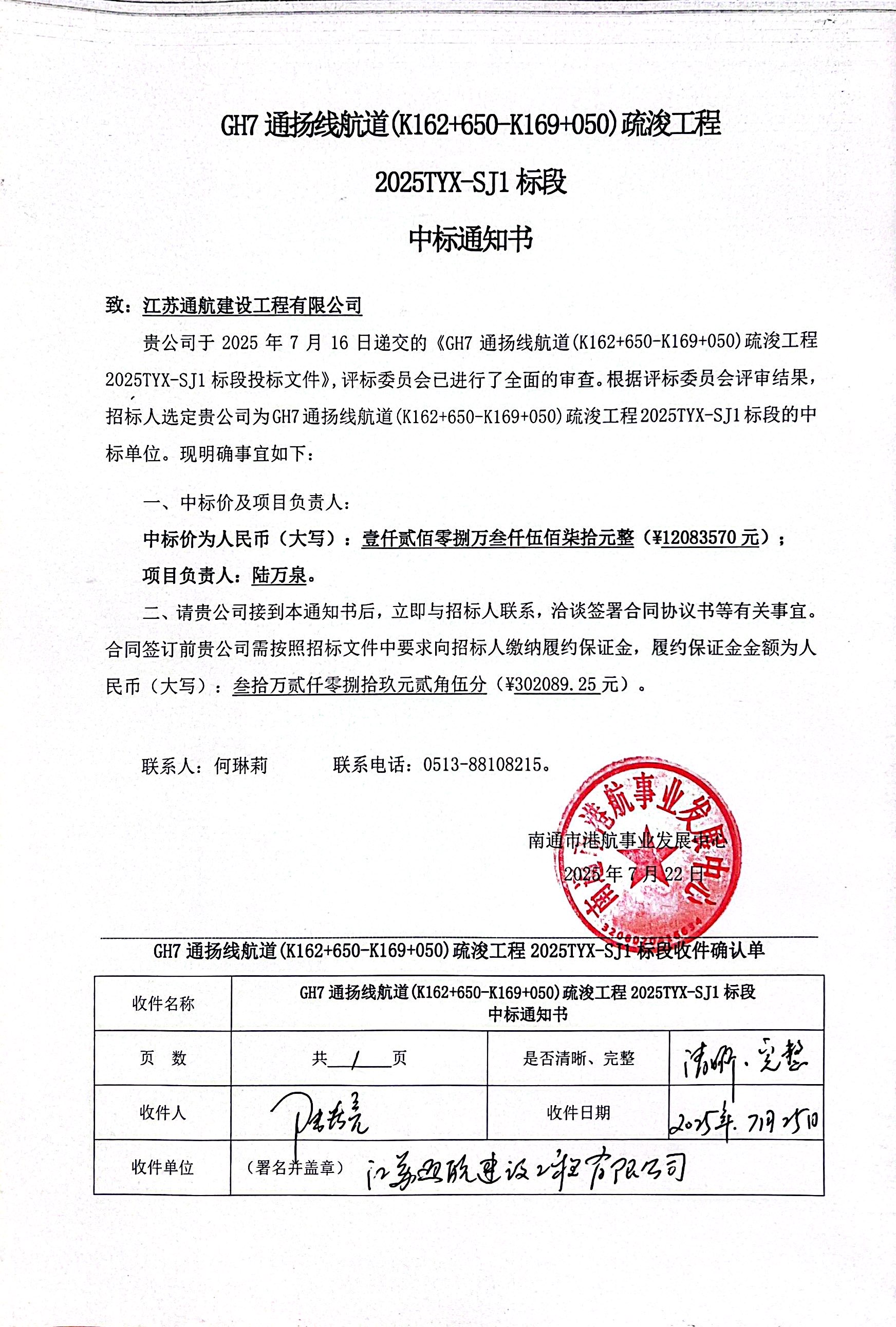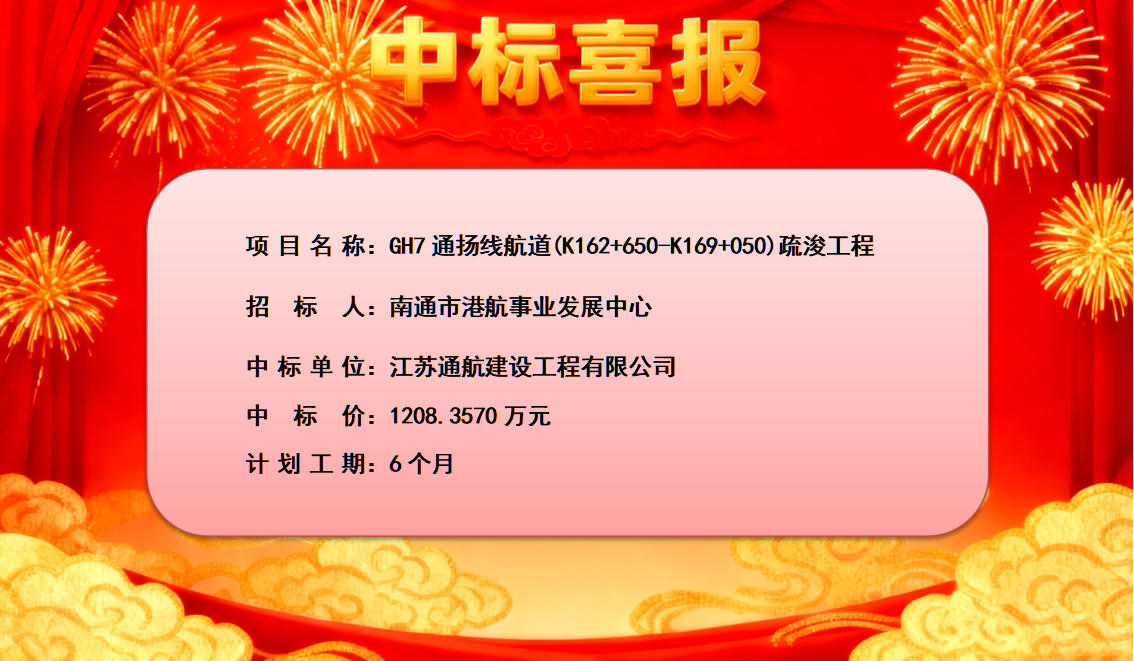 2025年7月22日,江苏通航建设工程有限公司以1208.3570万元中标GH7通扬线航道(K162+650-K169+050)疏浚工程,该项目计划工期6个月。