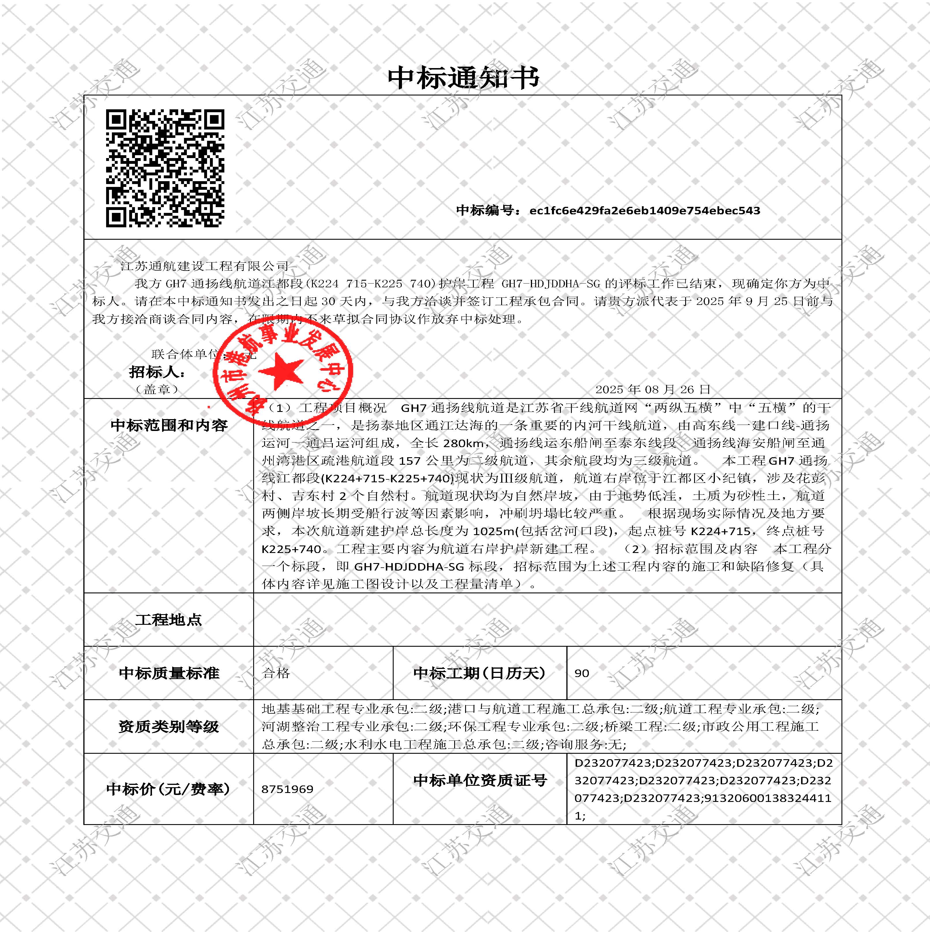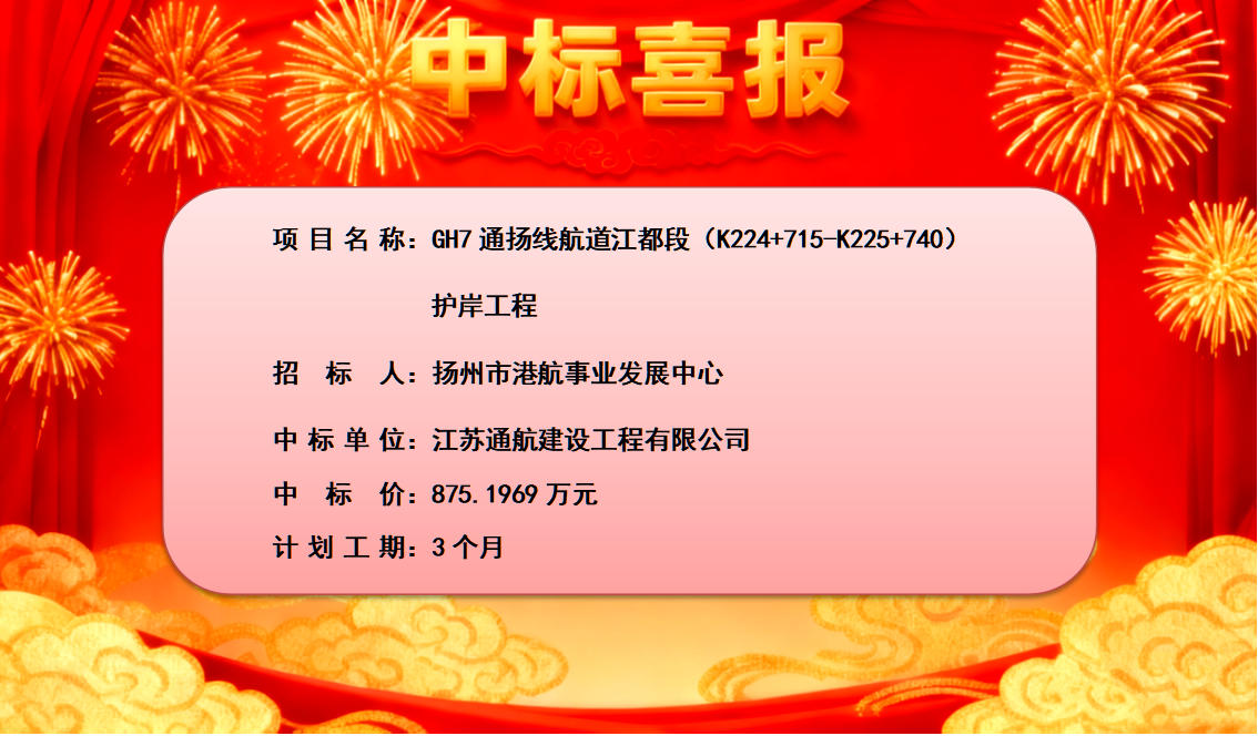 近日,扬州市港航事业发展中心就“GH7通扬线航道江都段(K224+715-K225+740)护岸工程”完成招标工作,江苏通航建设工程有限公司于2025年8月21日以875.1969万元中标,项目计划工期为3个月,质量目标定为合格等级,并确保无安全责任事故。