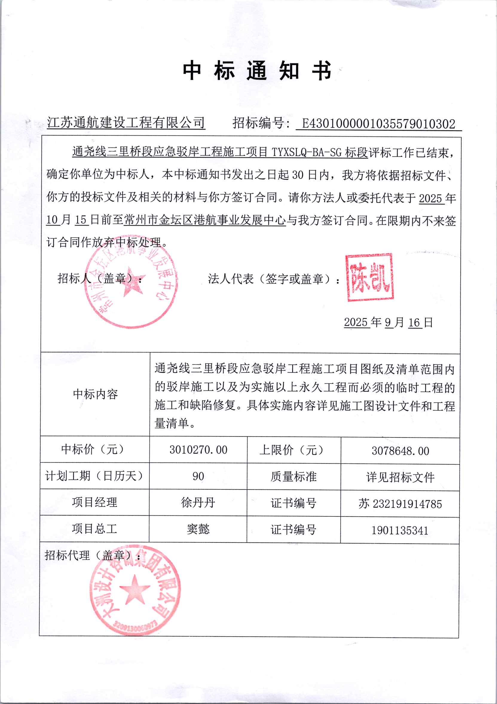 我公司参与投标的通尧线三里桥段应急驳岸工程施工项目(项目业主——常州市金坛区港航事业发展中心),根据2025年9月11日发布的评标结果公示,我公司为第一中标候选人,中标价格为人民币叁佰零壹万零贰佰柒拾元整(小写:3,010,270.00元),工期3个月。